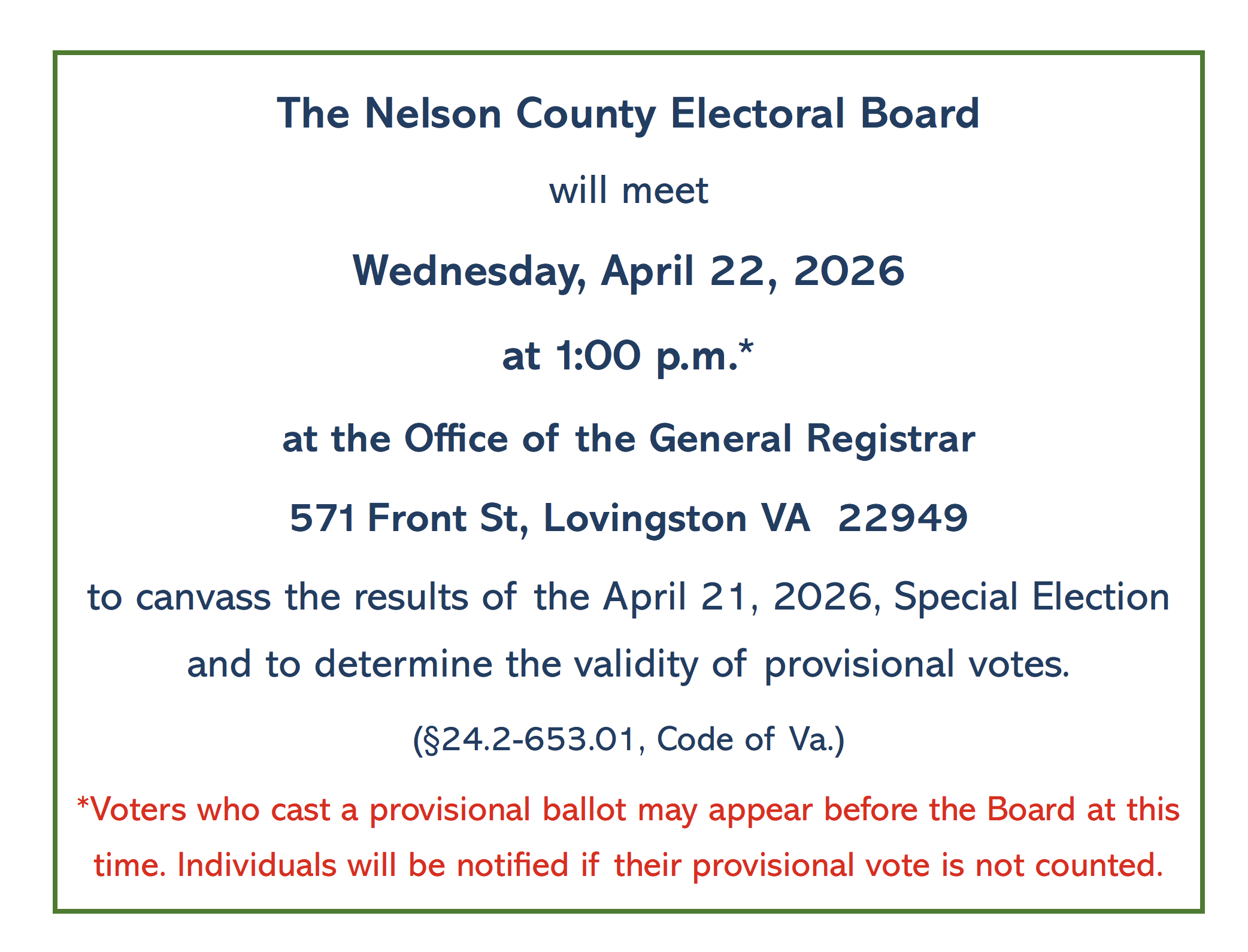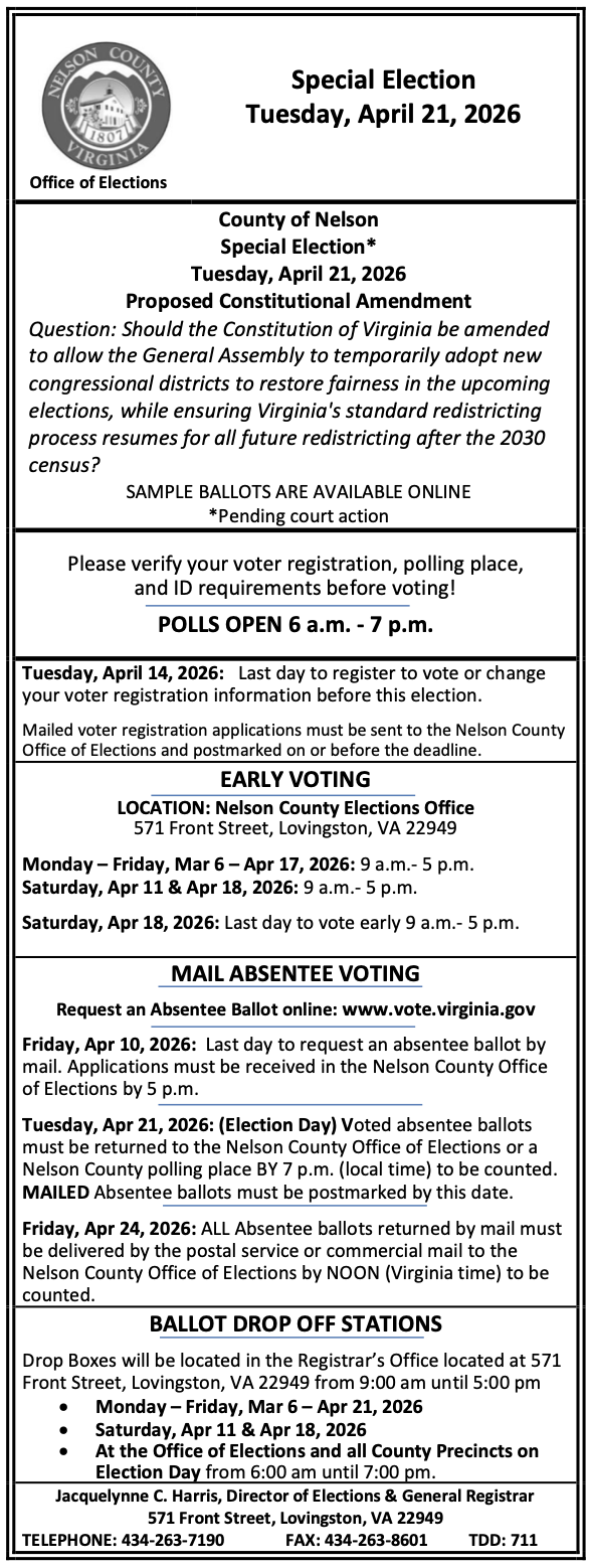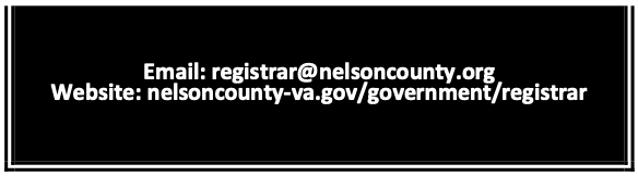 The Office of General Registrar and Electoral Board of the County of Nelson Virginia strive to promote the highest level of service to the citizens of the Commonwealth by providing equitable opportunities to register and vote; and by maintaining accurate records relating to voter registration, elections, election officials, and candidates. We are committed to promoting democracy and public trust in our endeavors to ensure fair and impartial elections.