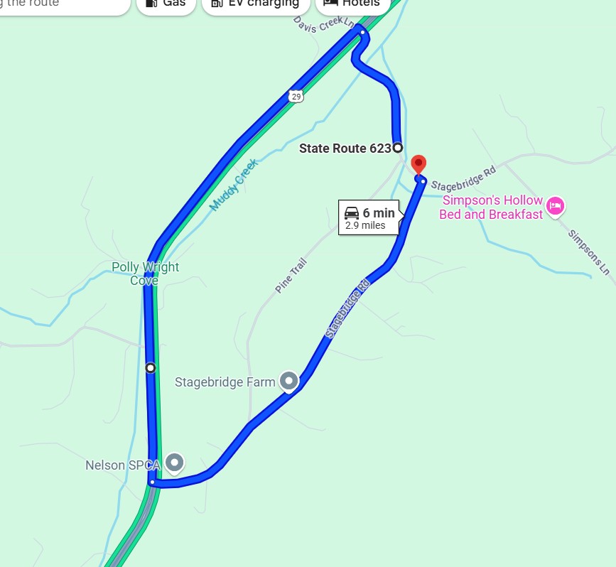 The Department of Transportation will provide adequate signs for the closure and detour of this portion of Route 623 (Myndus Rd.) and will use Route 29, to Route 766 (Stagebridge Rd.) back to Route 623.
